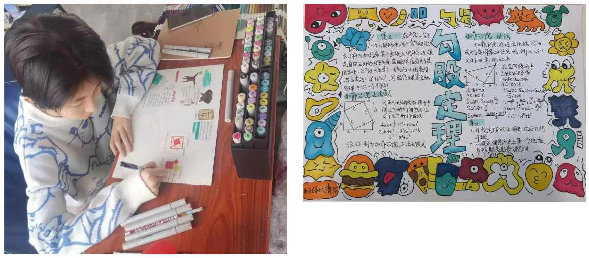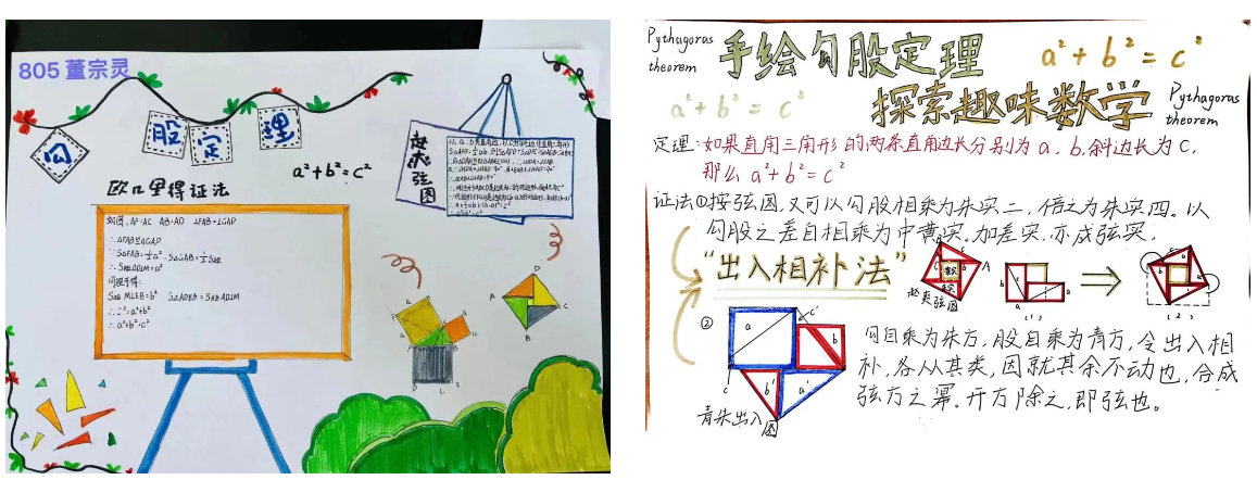 為了讓學(xué)生充分感受數(shù)字魅力,營(yíng)造學(xué)生學(xué)數(shù)學(xué)、愛(ài)數(shù)學(xué)的濃厚氛圍,數(shù)學(xué)老師組織同學(xué)們?cè)诩倨谝?ldquo;勾股定理”為研究主題,制作了豐富多彩的手抄報(bào)。